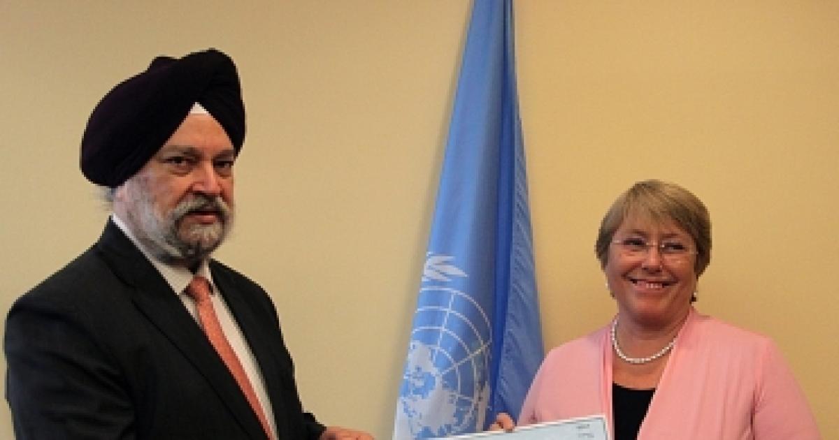 The cheque was handed over by Permanent Representative of India to the UN Ambassador Hardeep Singh Puri to the Under Secretary General and Executive Director of UN Women Michele Bachelet.