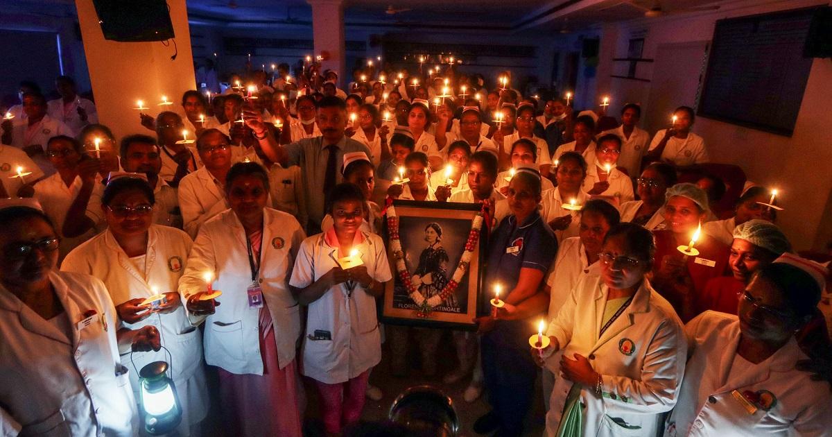 IMAGE: Nurses hold a candlelight vigil to renew their pledge in front of the picture of Florence Nightingale, at Rajiv Gandhi Hospital in Chennai, Tamil Nadu, May 11, 2024. Photograph: ANI Photo