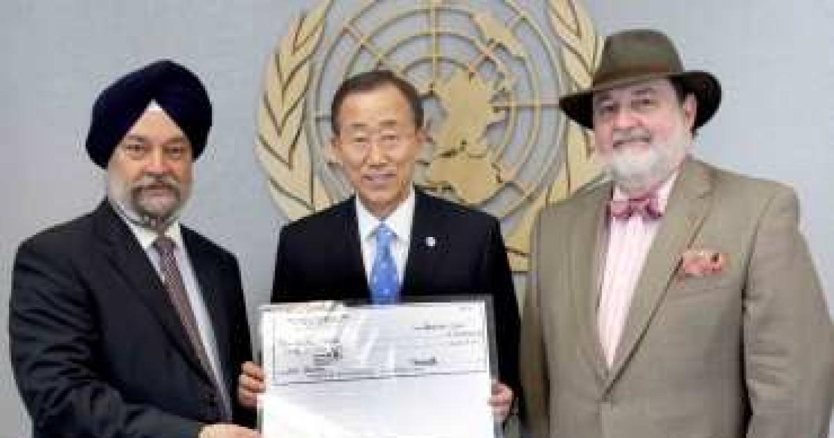 Image: Ambassador Hardeep Singh Puri (left), India's permanent Representative to the United Nations, hands over a cheque to the UN Secretary General Ban-Ki Moon. Ambassador Abdullah Hossain Haroon (right), permanent Representative of Pakistan is also seen.