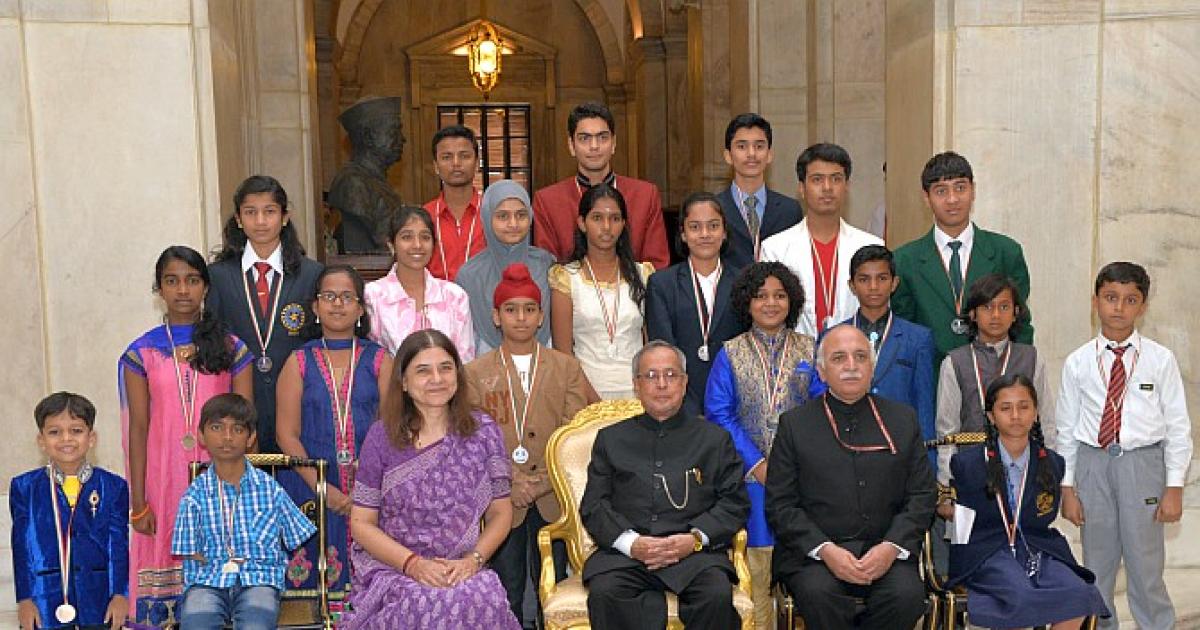 Image: President Pranab Mukherjee with the recipients of National Child Awards to Children for Exceptional Achievements 2014 at Rashtrapati Bhavan