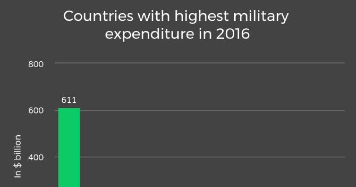 Saudi Arabia was the third largest spender in 2015 but dropped to fourth position in 2016. Spending by Saudi Arabia fell by 30 per cent in 2016 to $63.7 billion, despite its continued involvement in regional wars.