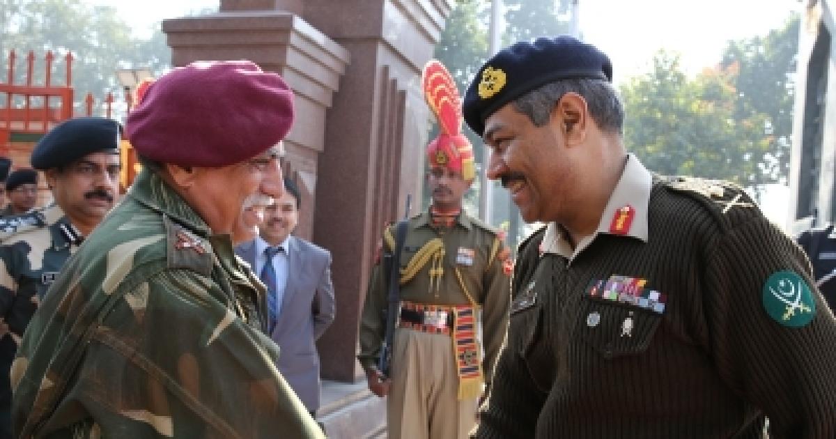 Image: Lt Gen Vinodh Bhatia, DGMO of the Indian Army, shakes hands with Maj Gen Aamer Riaz, DGMO of the Pakistan army, at the Wagha Border on Tuesday