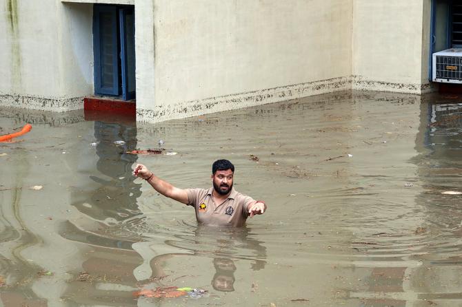 IMAGE: A resident at the flooded IIIM Hostel in Jammu after heavy rains. Photograph: ANI Photo