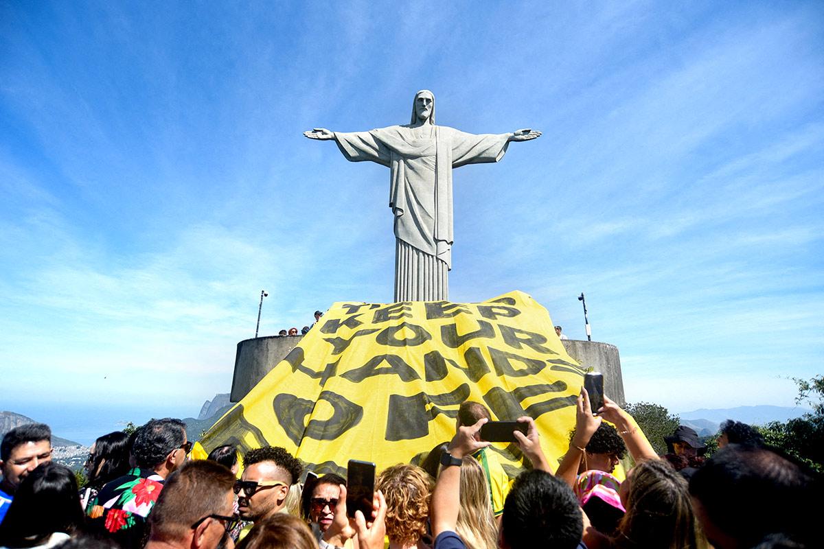 IMAGE: Brazilians protest with banners 'Trump keep your hands off Brazil!' against US President Donald Trump's imposition of tariffs on Brazilian products at the Christ The Redeemer statue in Rio de Janeiro. Photograph: Tita Barros/Reuters