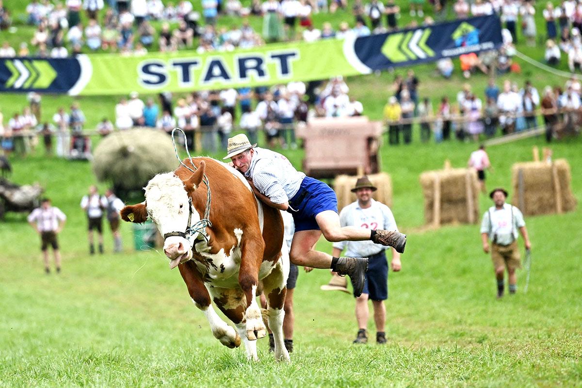 IMAGE: Farmer Peter Ginter rides ox Manni during a traditional ox race in the southern Bavarian village of Haunshofen, Germany. Photograph: Angelika Warmuth/Reuters