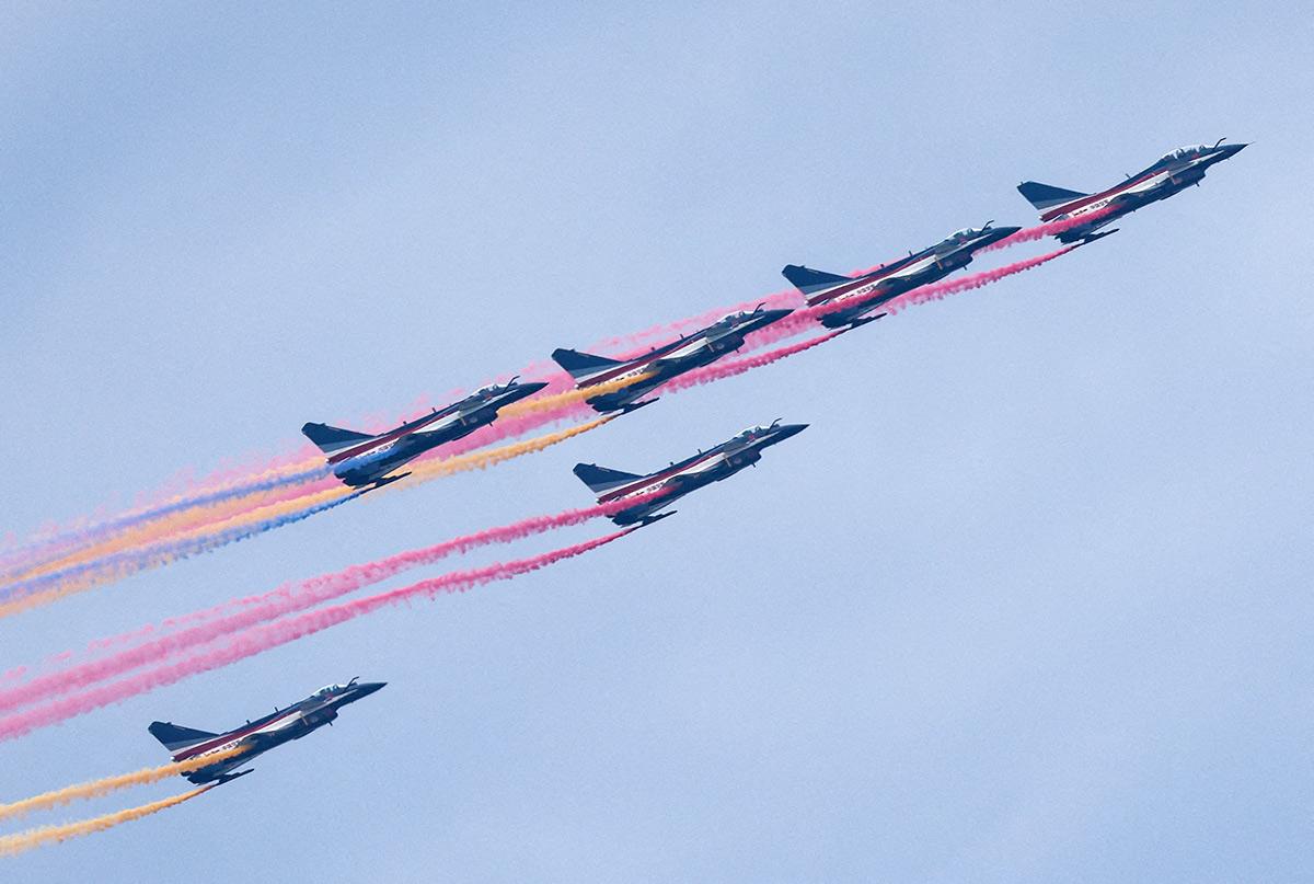 IMAGE: J-10 fighter jets of the Chinese People's Liberation Army Air Force's Bayi aerobatic team release coloured smoke during a flypast rehearsal ahead of the military parade to mark the 80th anniversary of the end of World War 2 in Beijing. Photograph: Maxim Shemetov/Reuters