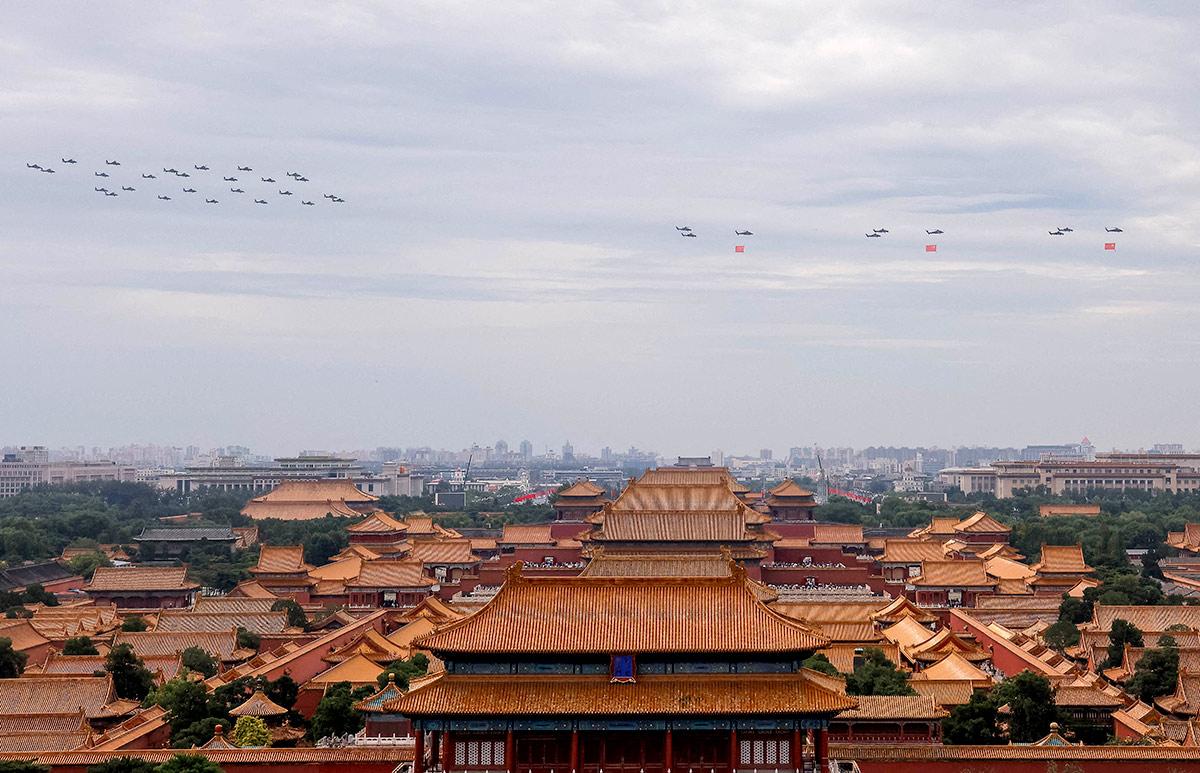 IMAGE: Military helicopters fly over the rooftops of the Forbidden City in Beijing during a flypast rehearsal. Photograph: Maxim Shemetov/Reuters