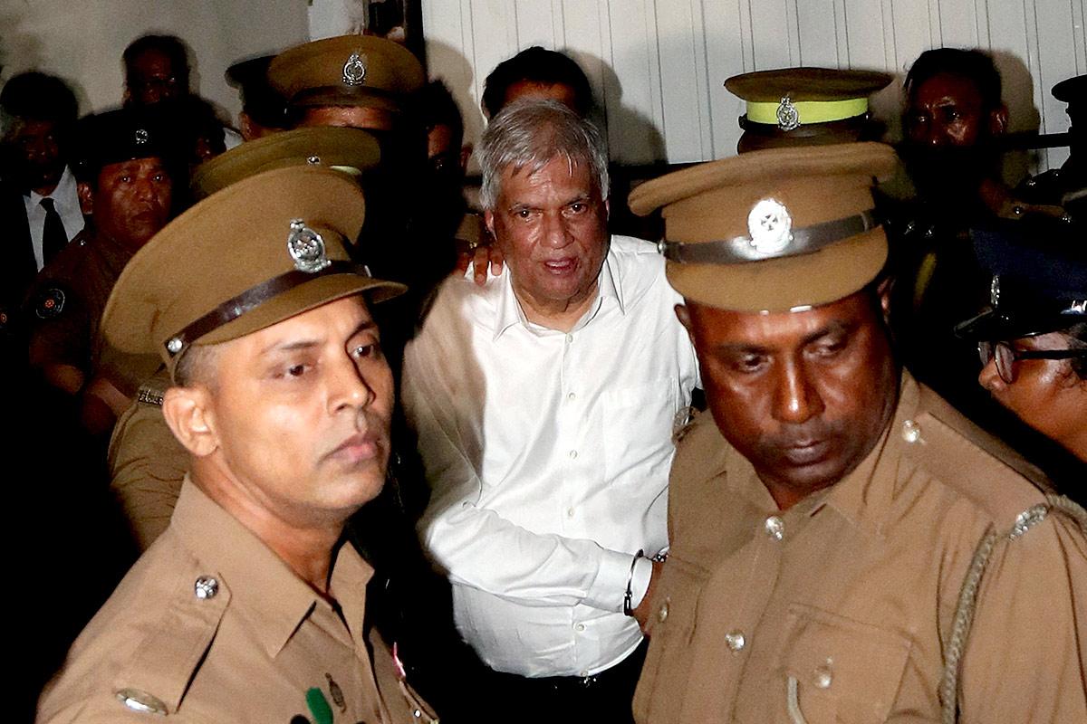 IMAGE: Sri Lanka's former president Ranil Wickremesinghe is escorted by prison and police officials as he leaves the magistrate's court in Colombo. Photograph: Lahiru Harshana/Reuters