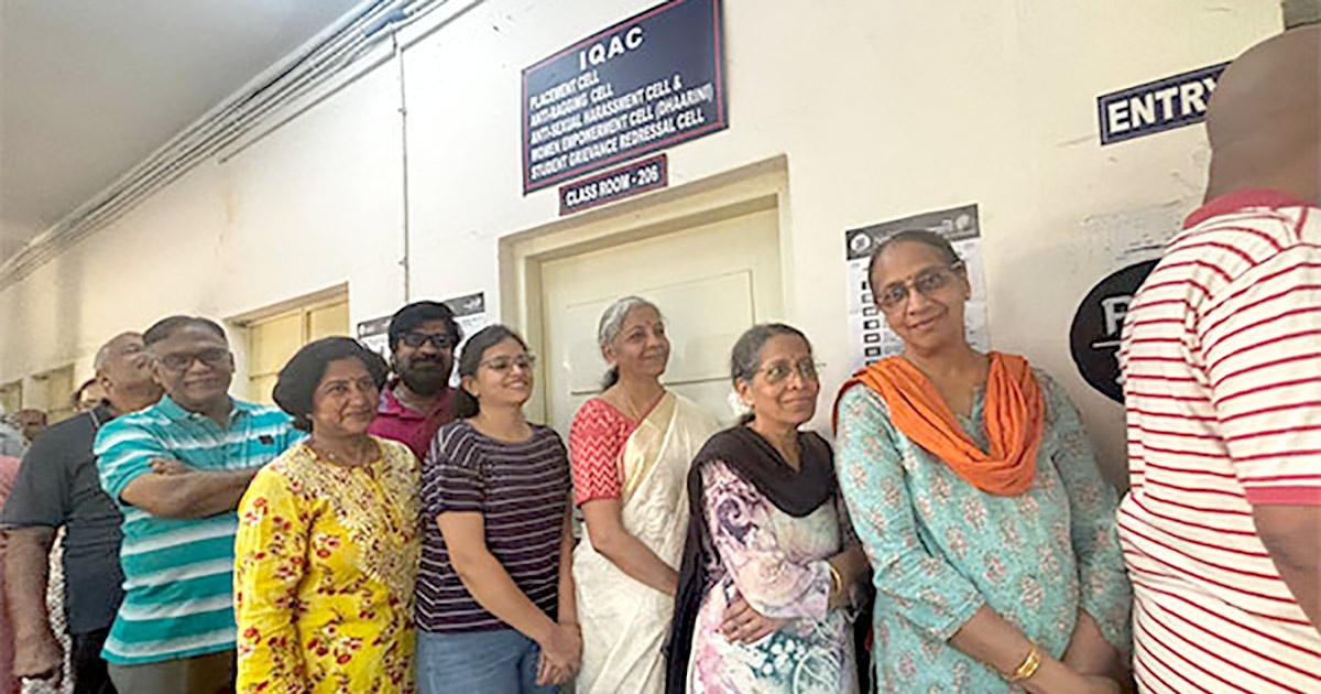 IMAGE: Finance Minister Nirmala Sitharaman waits in queue for her turn to vote in Bengaluru. Photograph: ANI Photo