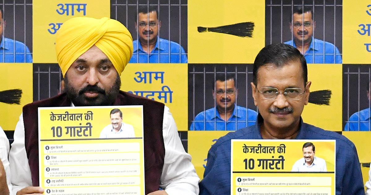 IMAGE: Aam Aadmi Party National Convener Arvind Kejriwal releases the AAP manifesto for the Lok Sabha elections along with AAP leader Bhagwant Mann at the party headquarters in New Delhi on Sunday, May 12, 2024. Photograph: Ishant/ANI Photo