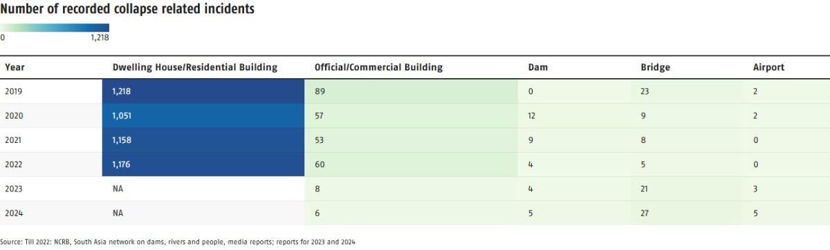 Between 2019 and 2024, 5,015 structural collapse incidents were reported across India, with 91 per cent involving dwelling houses or residential buildings (until 2022), 5.4 per cent official or commercial buildings, and 1.9 per cent bridges.