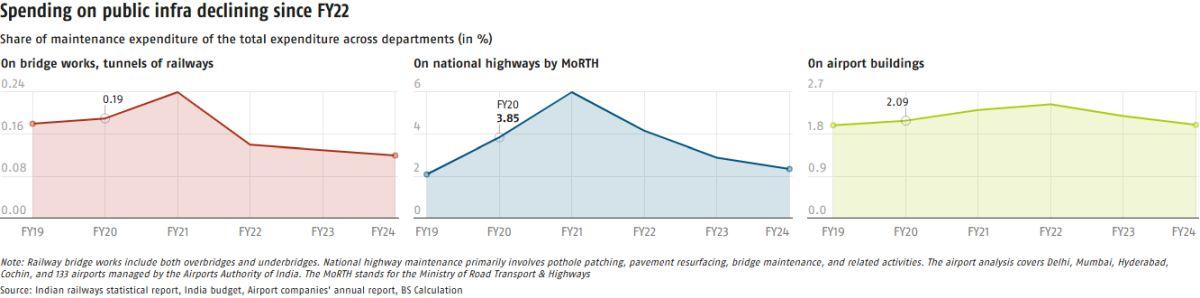 While absolute spending on the maintenance of bridges and tunnels by the Railways, highways by the Union road transport ministry, and leading airports has increased until FY24, it has declined as a share of total expenditure within their respective ministries or sectors.