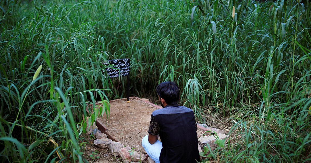 IMAGE: A man prays next to the grave of his mother, who died from the coronavirus disease (COVID-19), at a graveyard in New Delhi. Photograph: Adnan Abidi/Reuters