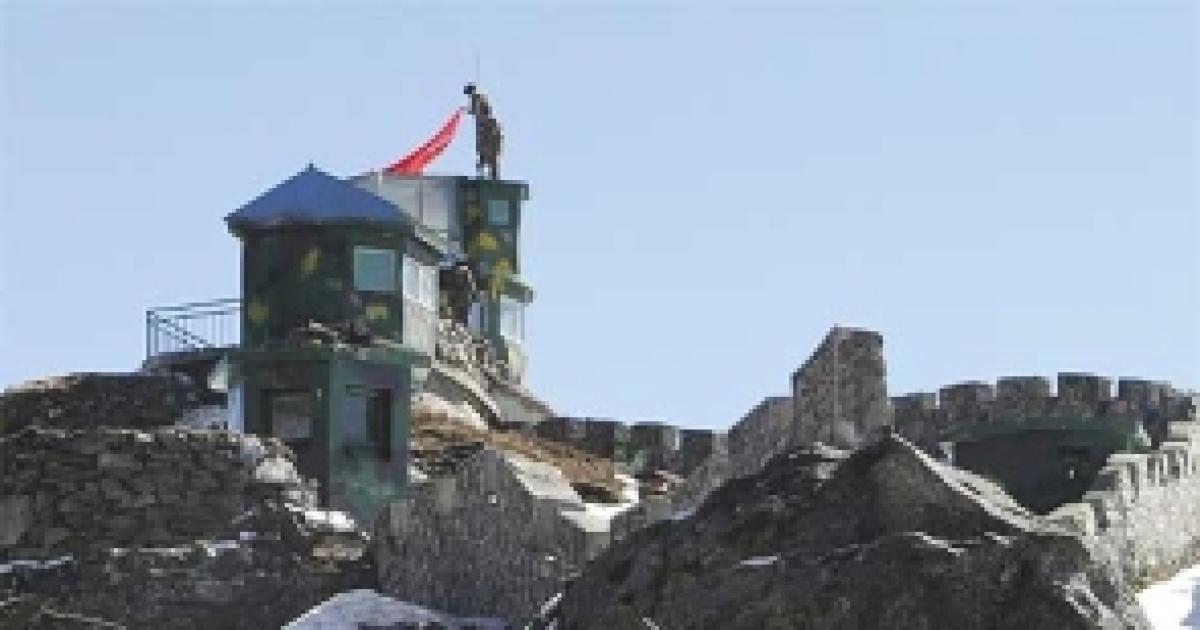 Image: A Chinese soldier put up a flag atop their post at the India-China trade route at Nathu-La Pass' Photograph: Reuters