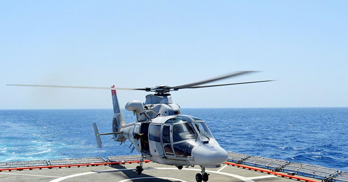 IMAGE: A helicopter lands on the INS Tarkash. This is not easy as it looks as the helicopter has to land on a moving ship. All photographs: ANI Photo