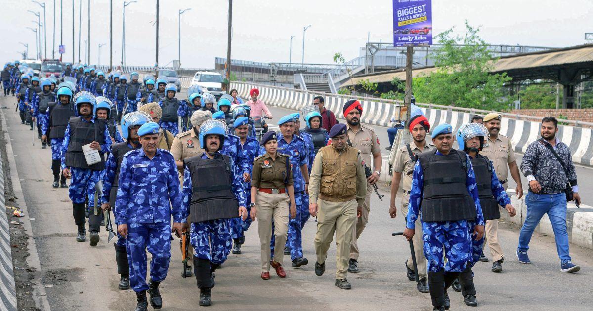 IMAGE: Rapid Action Force and police personnel conduct a flag march to maintain law and order after the arrest of associates of Waris Punjab De chief Amritpal Singh, in Moga. Photograph: ANI Photo