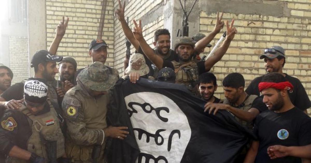 Image: Iraqi security forces stand with an Islamist State flag which they pulled down after their victory over the militants in Ramadi. Photograph: Reuters