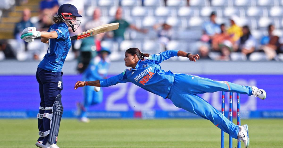 IMAGE: Radha Yadav dives for the ball next to England's Emma Lamb during the women's third One Day International at the Riverside ground, Chester-le-Street. Photograph: Ed Sykes/Reuters