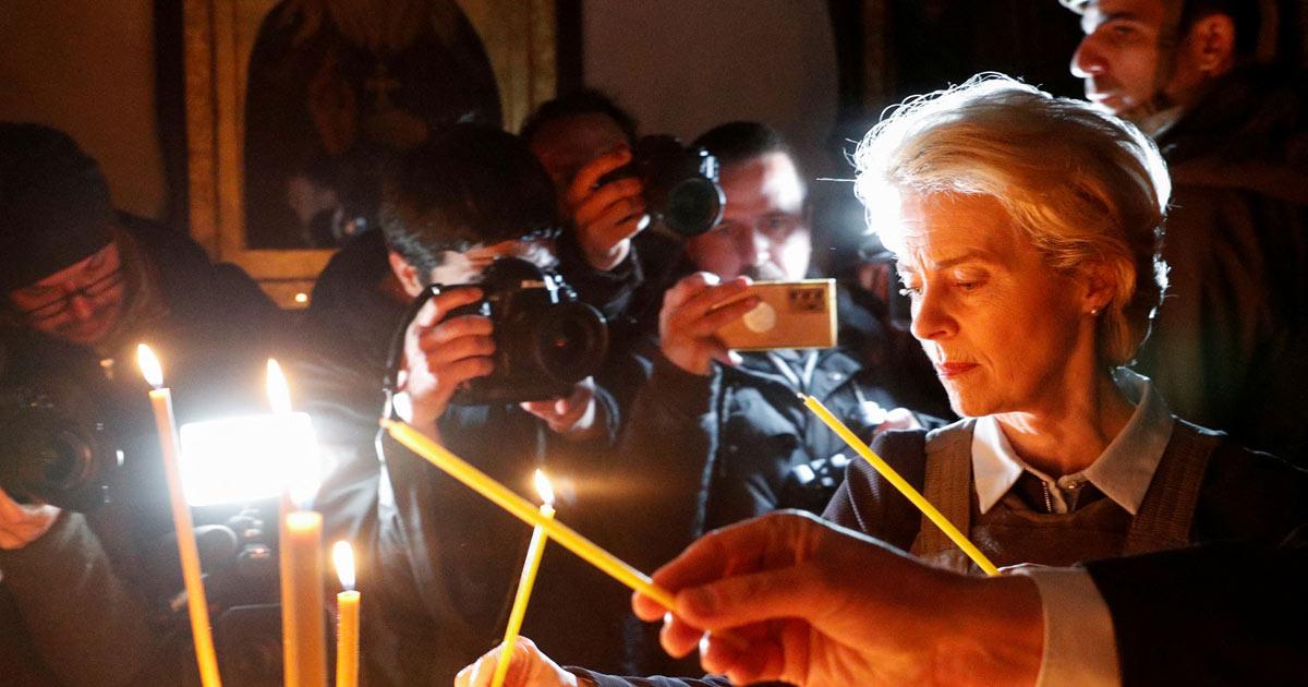 IMAGE: European Commission President Ursula von der Leyen lights a candle in a church near a mass grave in Bucha. Photograph: Valentyn Ogirenko/Reuters