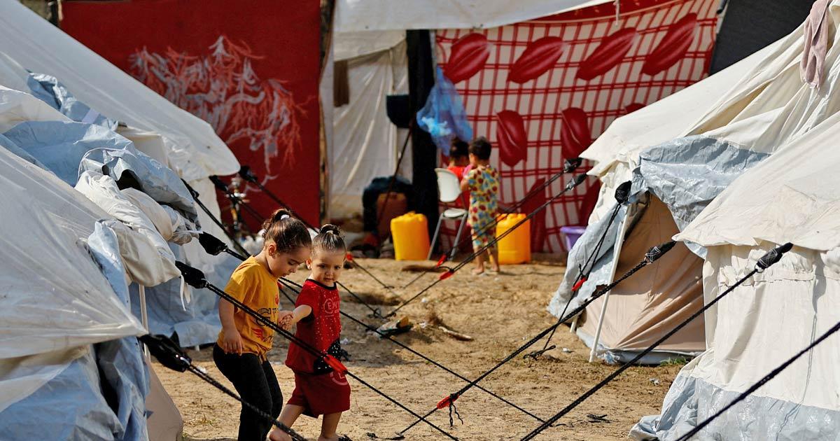 IMAGE: Displaced Palestinian kids, who fled their home amid Israeli strikes take shelter in a tent camp at a United Nations-run centre in Khan Younis in the southern Gaza Strip. Photograph: Ibraheem Abu Mustafa/Reuters