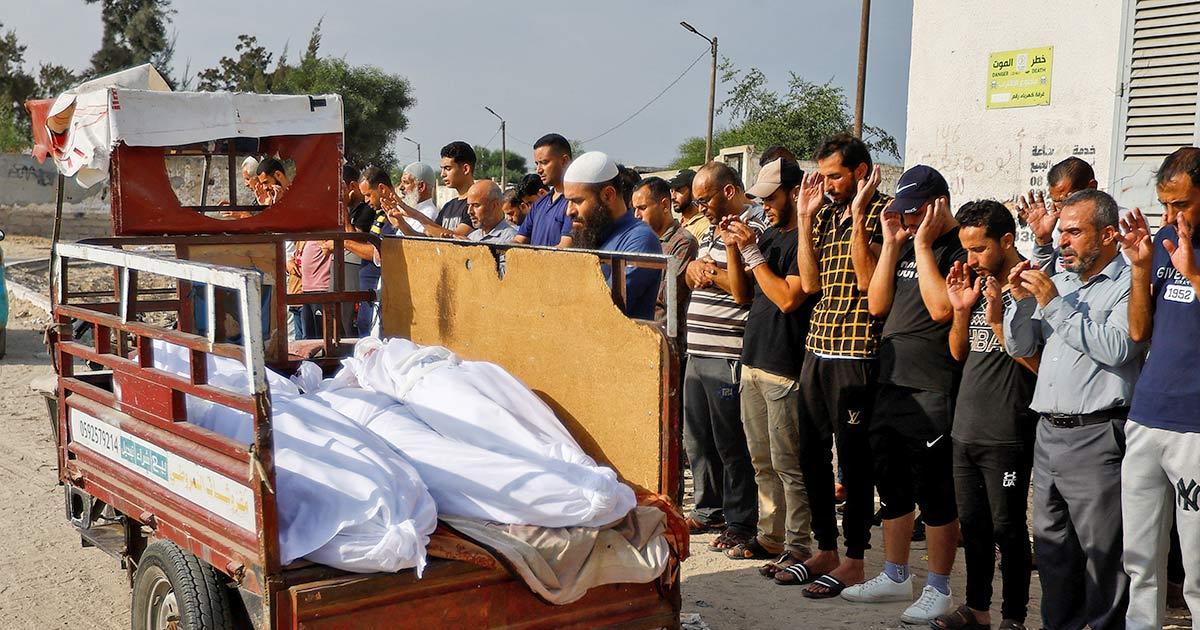 IMAGE: Mourners pray next to bodies of Palestinians killed in Israeli strikes during their funeral. Photograph: Ibraheem Abu Mustafa/Reuters