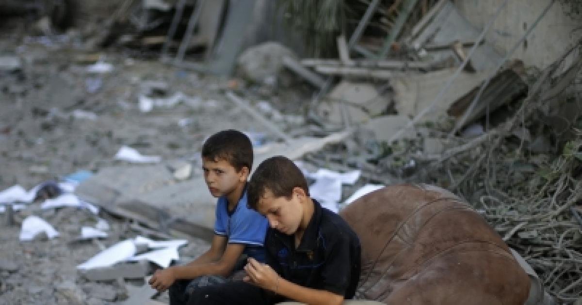Image: Palestinian boys sit on a sofa outside their house, which witnesses said was damaged in an Israeli air strike, in Gaza City. Photograph: Suhaib Salem/Reuters