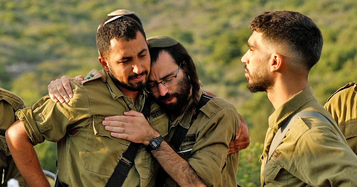 IMAGE: Members of the military embrace each other at the funeral of Israeli soldier Yedidya Asher Lev, who was killed in northern Gaza, in the Israeli settlement Heinanit in the Israeli-occupied West Bank. Photograph: Shir Torem/Reuters