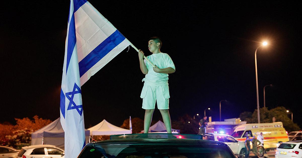 IMAGE: A boy holds an Israeli flag while standing on top of a car in Sderot after confirmation of Yahya Sinwar's death. Photograph: Amir Cohen/Reuters