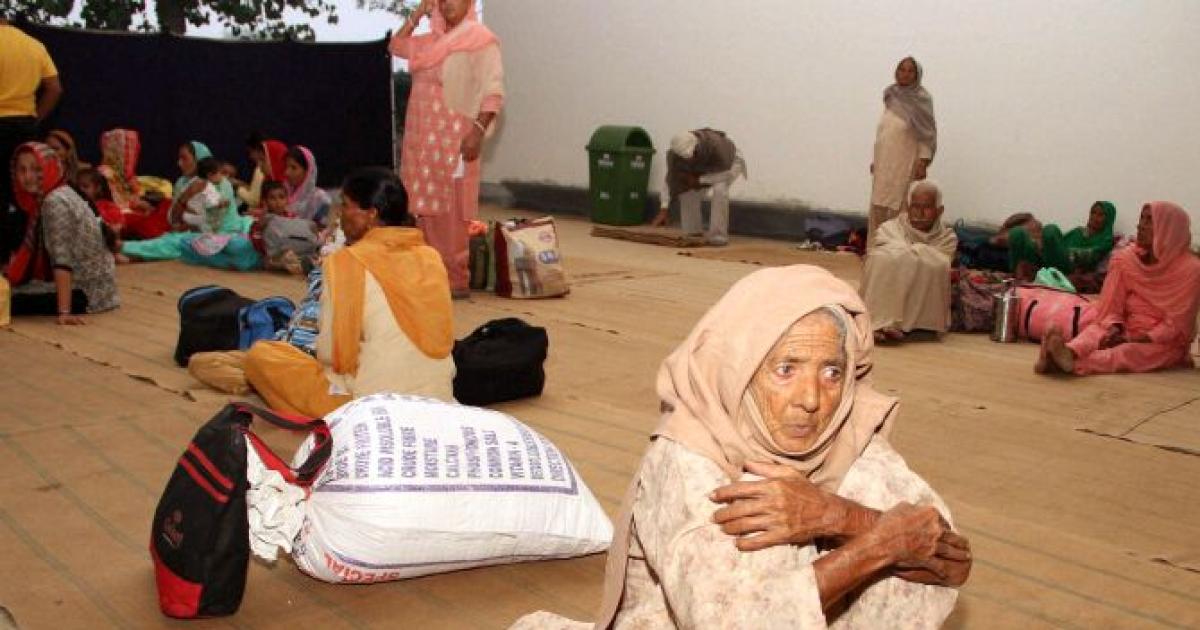Image: A resident of Jammu near the border takes refuge in a temple after her house was damaged in the cross border firing. Photograph: PTI