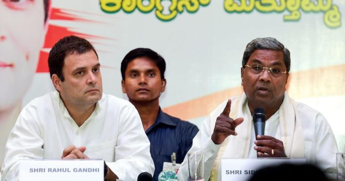 IMAGE: Karnataka Chief Minister Siddaramaiah with Congress president Rahul Gandhi during a press meet in Bengaluru last week. Photograph: Shailendra Bhojak/PTI Photo