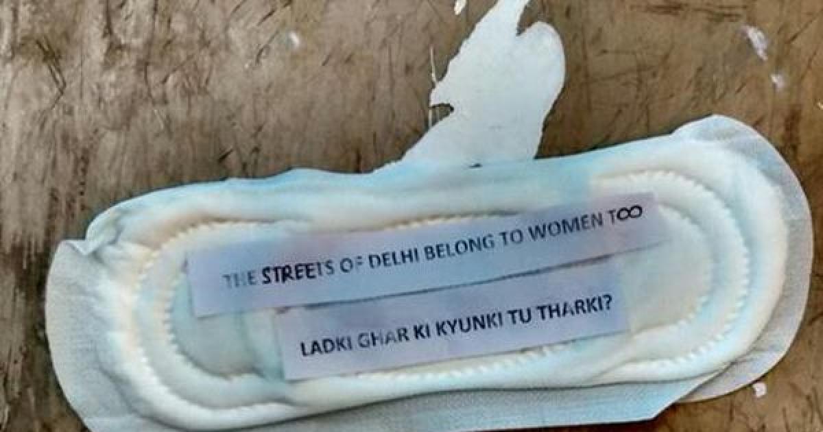 Image: One of the sanitary pads displayed which reads the message 'The streets of Delhi belong to women too.' Photograph: padsagainstsexism-Delhi/Facebook
