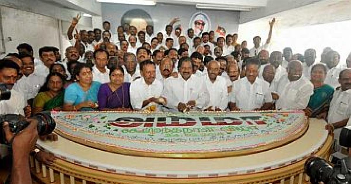 All India Anna Dravida Munnetra Kazhagam chief J Jayalalithaa, who is eyeing a larger role for herself in the national politics after Lok Sabha polls, was on Monday presented a cake resembling Parliament by her party colleagues on her 66th birthday.