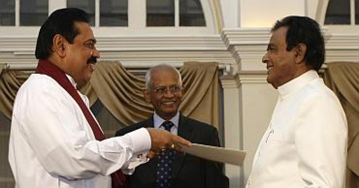 Image: Sri Lanka's President Mahinda Rajapaksa (L) hands over the oath of office to new Prime Minister Dissanayake Mudiyansalage Jayaratne (R) as the secretary to the president, Lalith Weeratunga, looks on in Colombo.