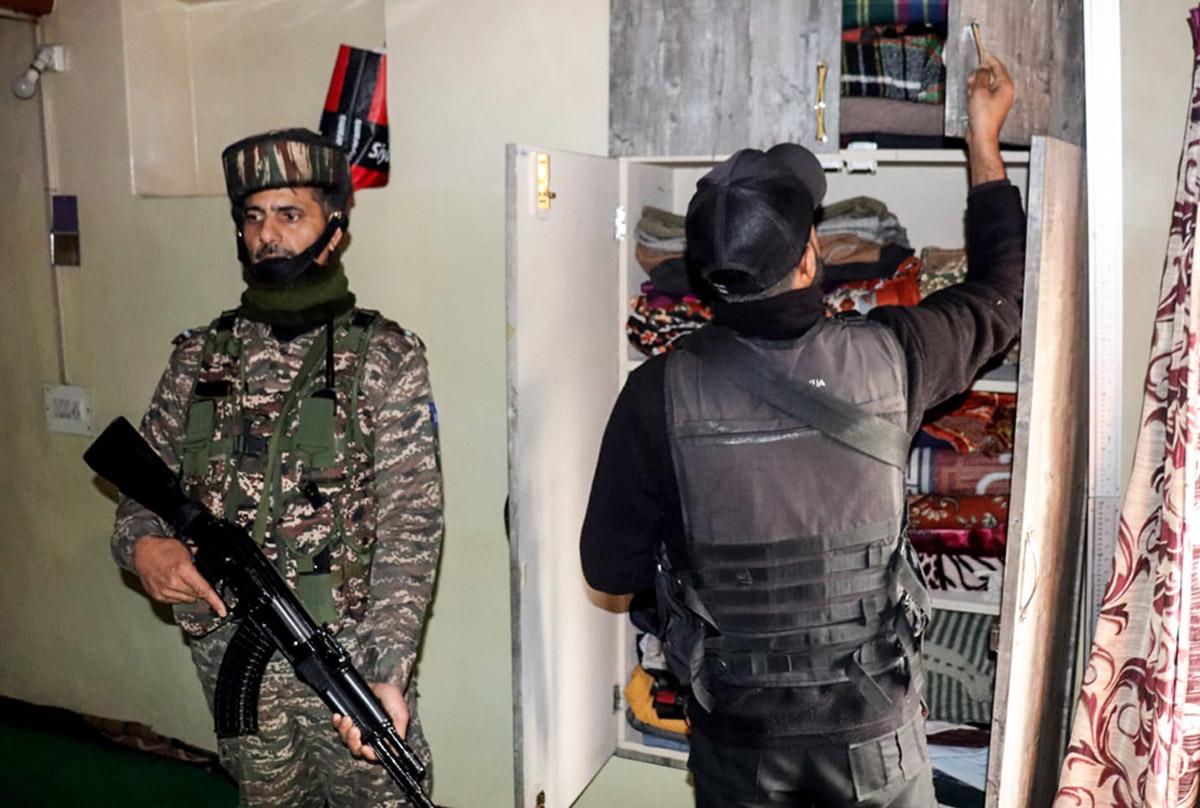 IMAGE: Srinagar police with Central Reserve Police Force conduct searches at residences of members of the Jammu and Kashmir National Panthers Party, overground workers, and UAPA/PSA accused currently on bail in Srinagar, here and below. Photograph: ANI Photo