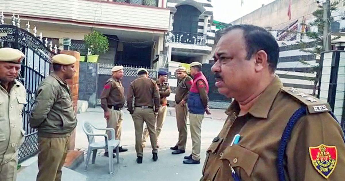 IMAGE: Police personnel stand guard outside a house at Azad Nagar in Yamunanagar, Haryana, as the NIA conducts searches and raids at more than 70 places across various states, February 21, 2023. Photograph: ANI Photo