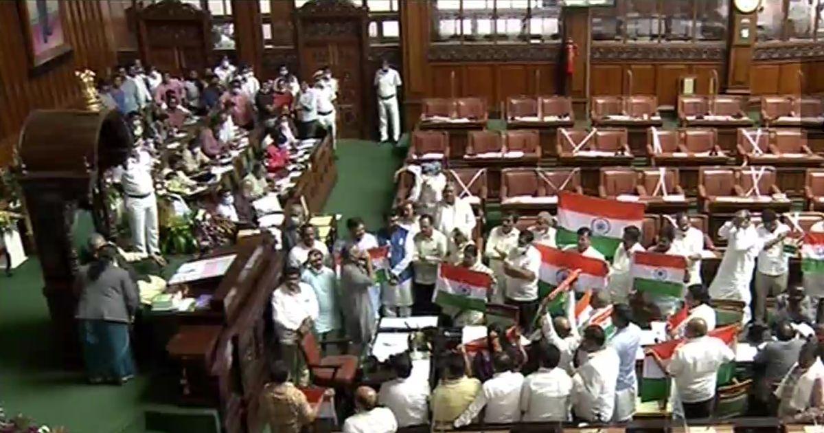 Earlier, both leaders were seen indulging in heated personal exchanges in the assembly by calling each other "desha drohi" and "rashtra drohi".