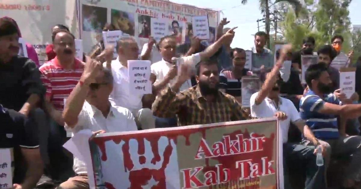 A group of Kashmiri Pandits staged a demonstration in Jammu on Wednesday in support of the demand for the relocation of the community members employed in Kashmir under the prime minister's package, who are on protest following the killing of their colleague, Rahul Bhat, by terrorists earlier this month.