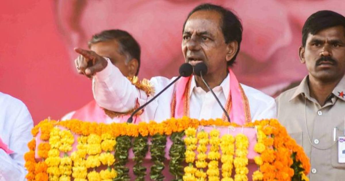 IMAGE: TRS president and caretaker chief minister K Chandrashekar Rao addresses a public meeting, in Sangareddy.. Photograph: PTI Photo