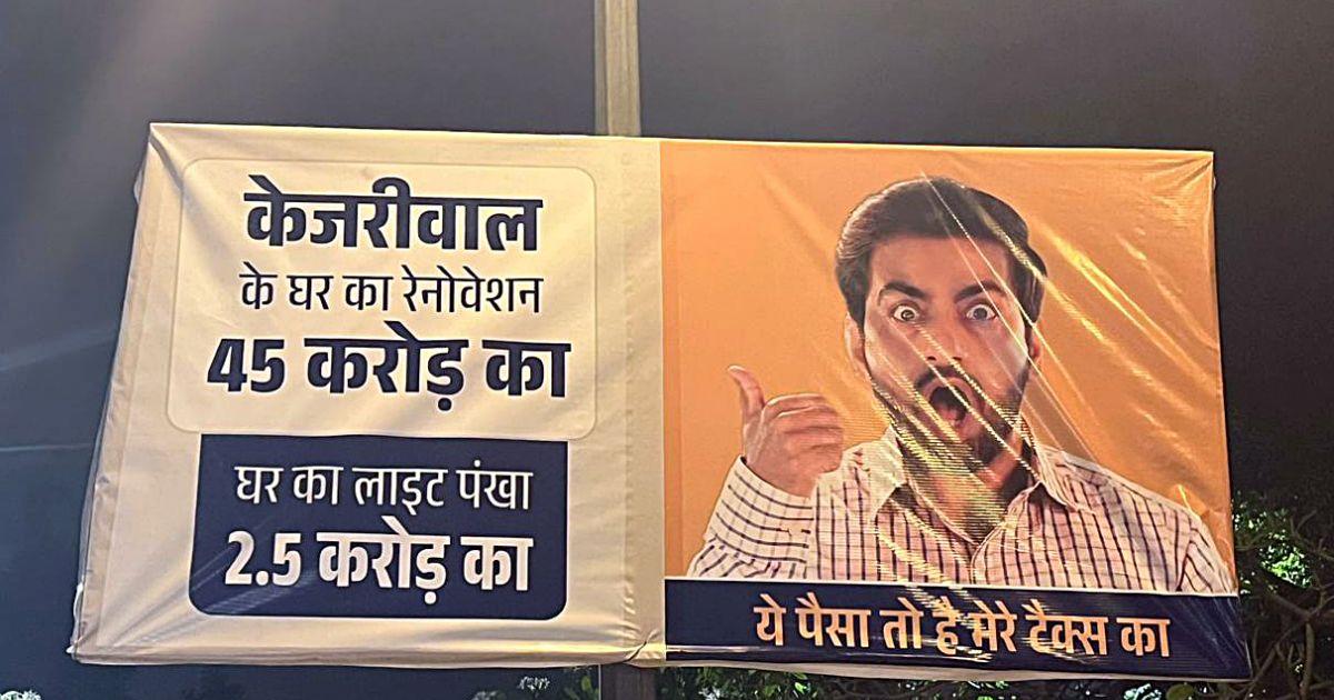 IMAGE: A billboard was installed accusing Delhi Chief Minister Arvind Kejriwal of spending crores on the renovation of his official residence, in New Delhi on Saturday. Photograph: ANI Photo