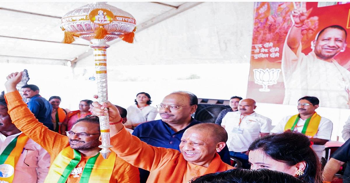 IMAGE: Uttar Pradesh CM Yogi Adityanath holds a mace during a public meeting in support of BJP candidate from Achalpur assembly seat, Pravin Vasant Tayade for the Maharashtra assembly elections, in Amravati, Maharashtra, November 12, 2024. Photograph: ANI Photo