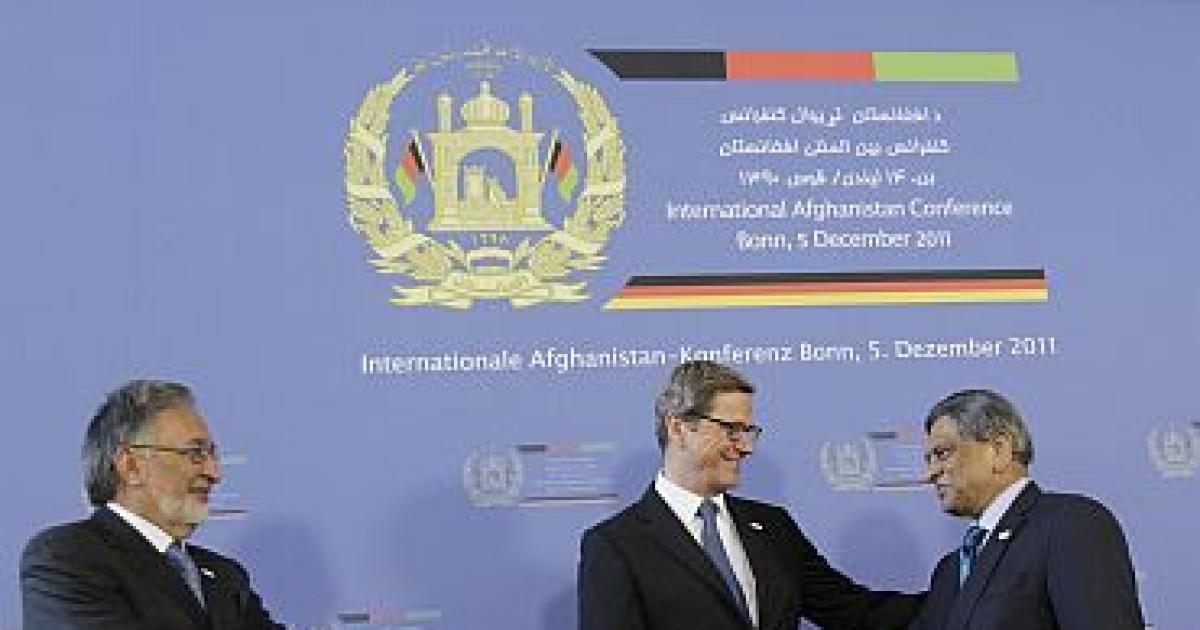 Image: S M Krishna (R) meets with his counterparts of Germany Westerwelle and Afghanistan counterpart Rassul at the International Afghanistan Conference in Bonn on Monday