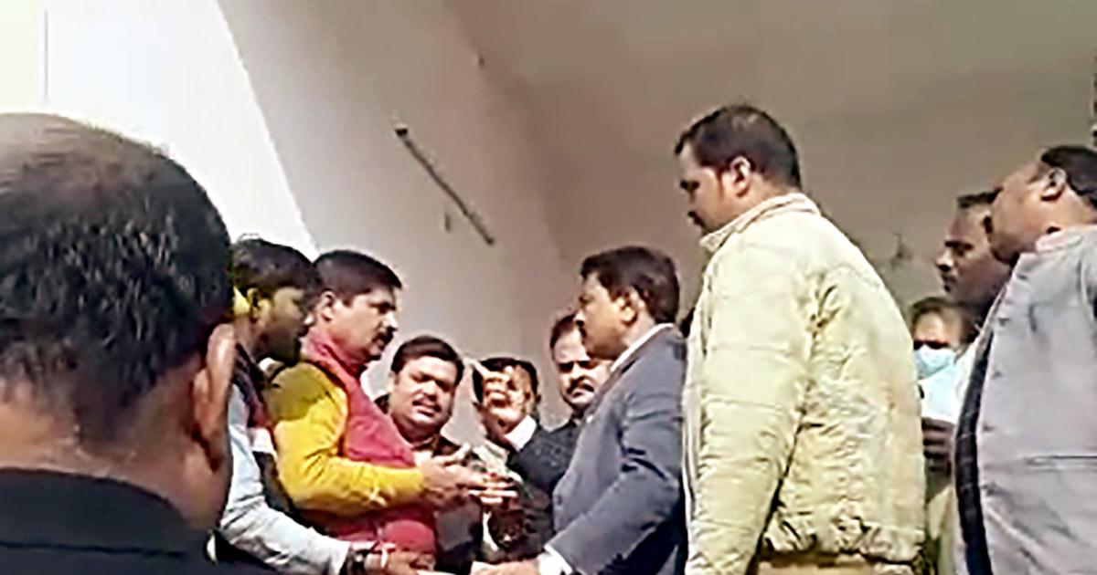 IMAGE: Teni loses his temper after journalists ask him about his son's involvement in the Lakhimpur Kheri tragedy. All photographs: ANI Photo