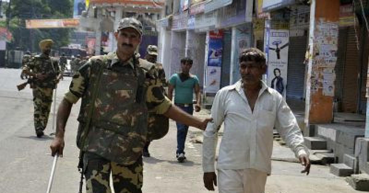 Image: Security personnel detain a man in curfew-hit Muzaffarnagar, Uttar Pradesh following communal clashes in September last year