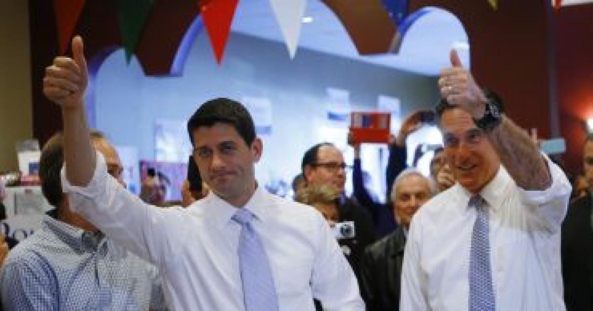 Image: Romney and vice-presidential nominee Ryan gestures to supporters during election in Richmond Heights, Ohio