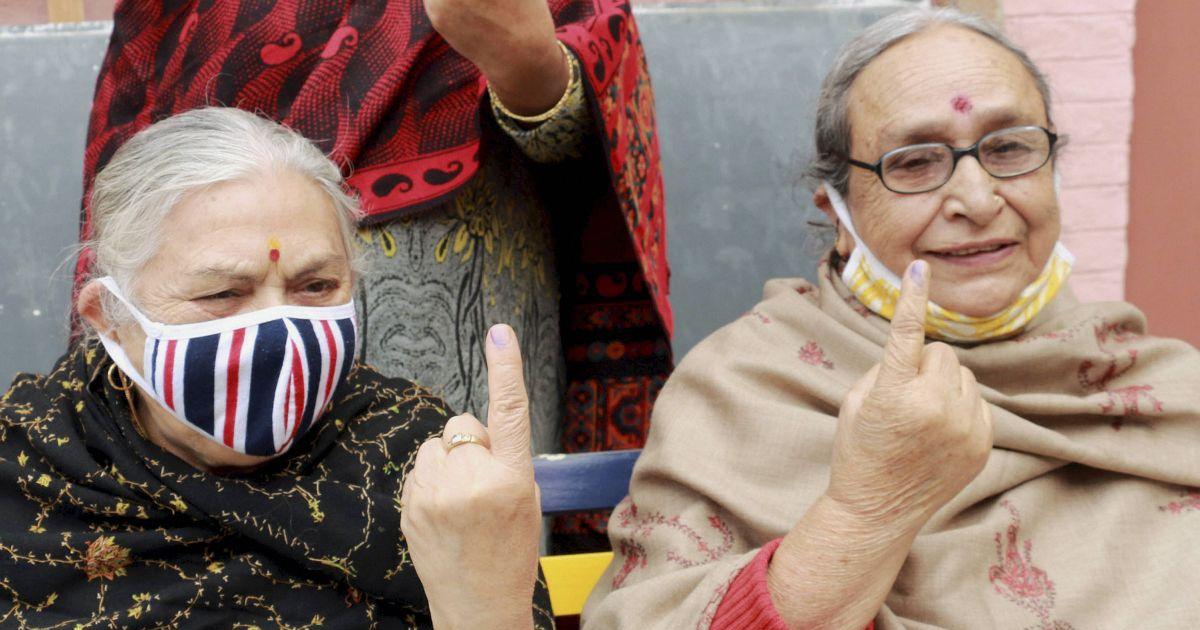 Tears well up in the eyes of 87-year-old Lal Chand and his 82-year-old wife Trivita as they hold up their inked fingers after casting their votes in the third phase of District Development Council (DDC) elections at a polling station at Chak Jaffar on Friday.
