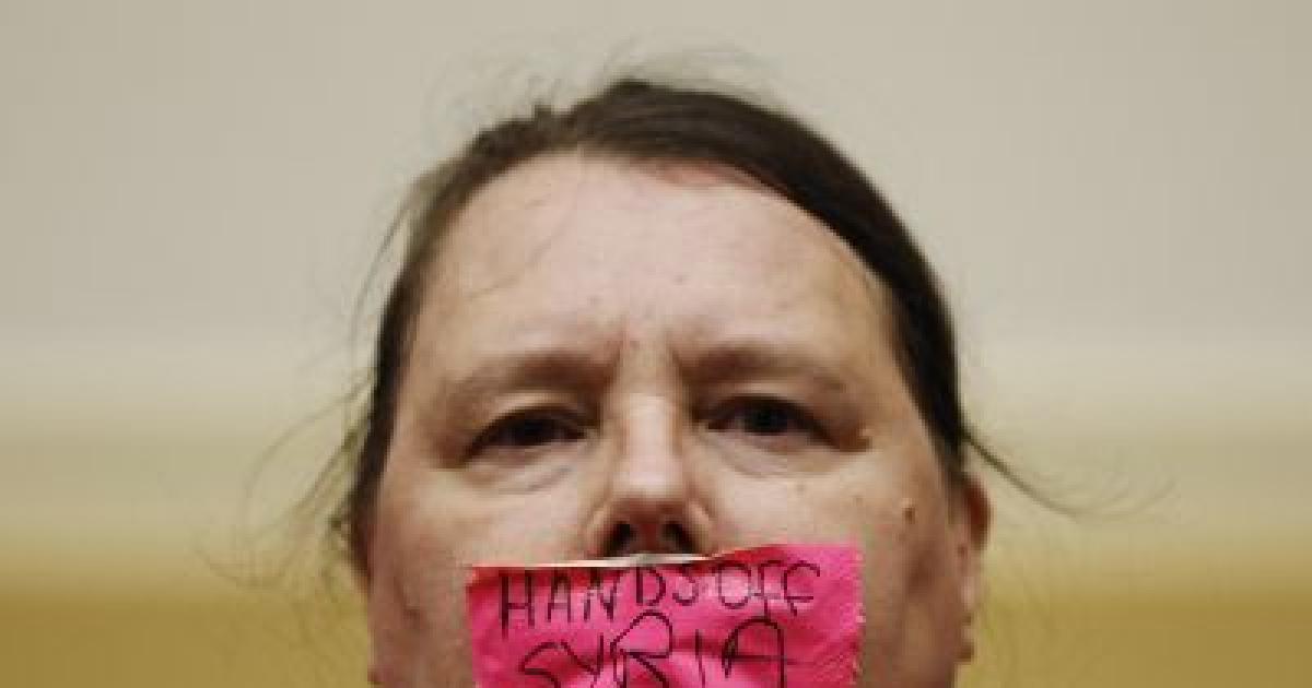 Image: A protester wears tape over her mouth to protest against the use of military strikes by the US on Syria