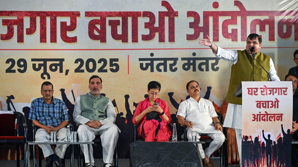 After a long absence from the public stage, after being routed in the Delhi assembly election in February, Aam Aadmi Party supremo Arvind Kejriwal launched the Ghar Rozgar Bachao Andolan (Save homes, jobs movement) at Jantar Mantar in New Delhi on Sunday with a protest against the ongoing demolition drives in slum clusters in the city.