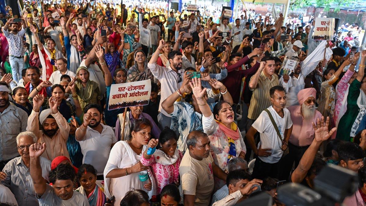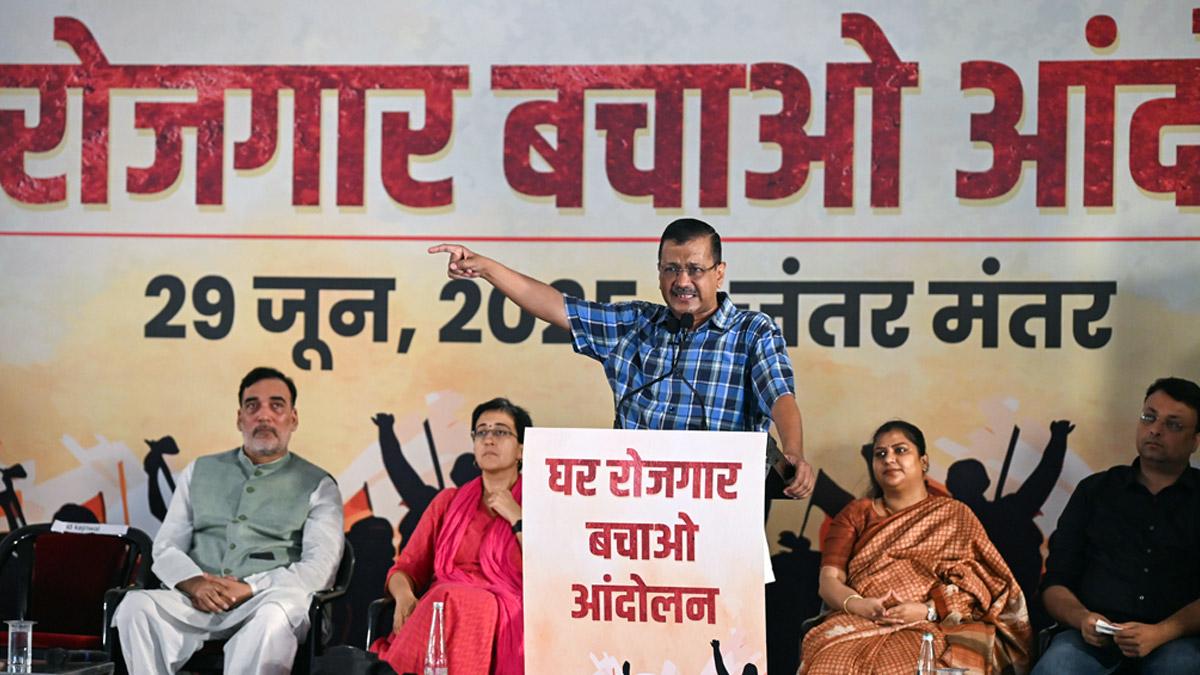 After a long absence from the public stage, after being routed in the Delhi assembly election in February, Aam Aadmi Party supremo Arvind Kejriwal launched the Ghar Rozgar Bachao Andolan (Save homes, jobs movement) at Jantar Mantar in New Delhi on Sunday with a protest against the ongoing demolition drives in slum clusters in the city.