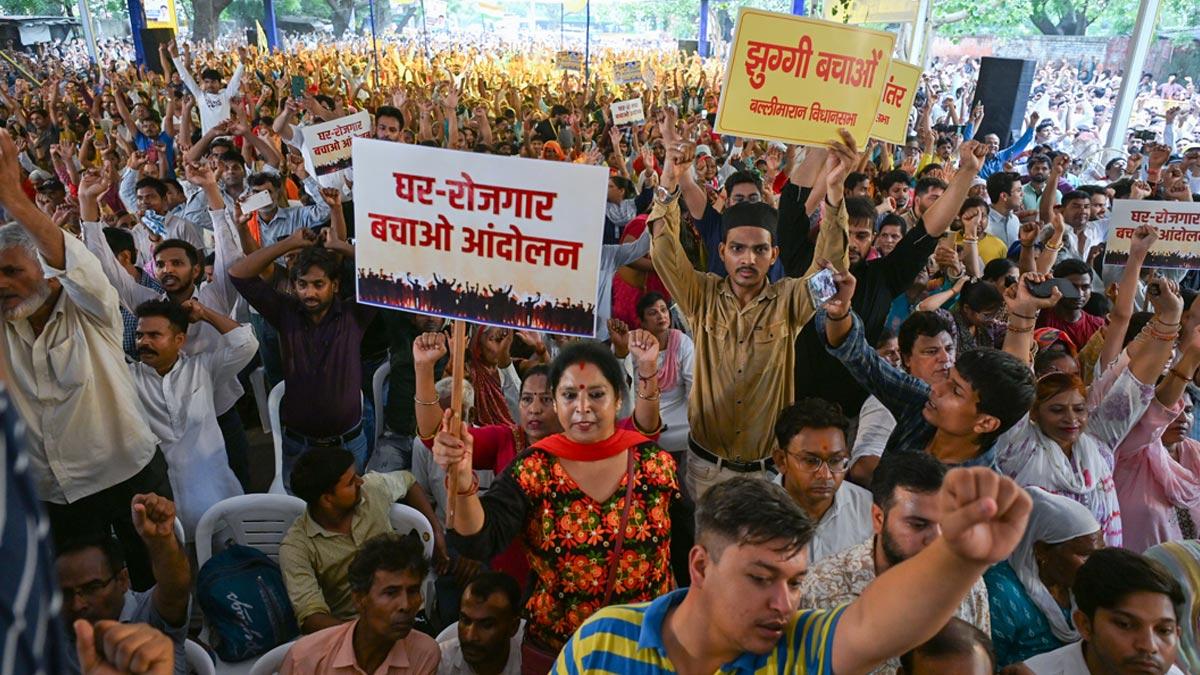 Kejriwal urged the slum dwellers to protest against the BJP-led government's demolition drives and called on them to reject both the BJP and Congress in future elections.