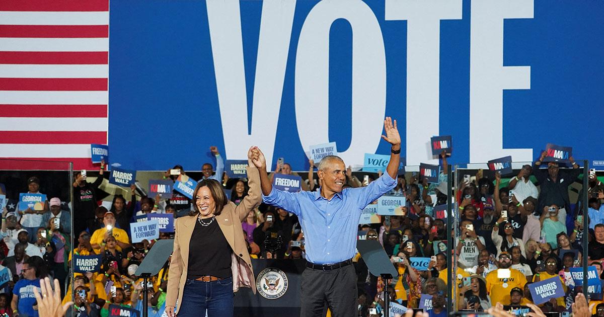 IMAGE: Former US President Barack Obama at a rally with Democratic presidential nominee US Vice President Kamala Harris in Atlanta, Georgia, October 24, 2024. Photograph: Megan Varner/Reuters